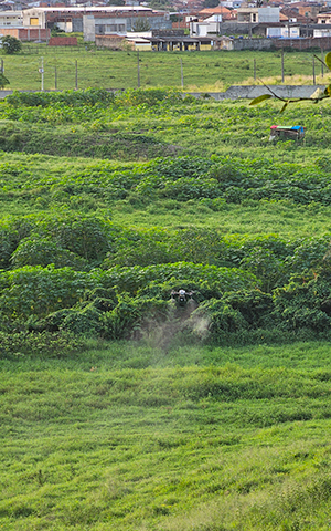 Um drone pode pulverizar entre 25 e 80 hectares por dia, dependendo do tipo de terreno, suas dificuldades e das condições climáticas.